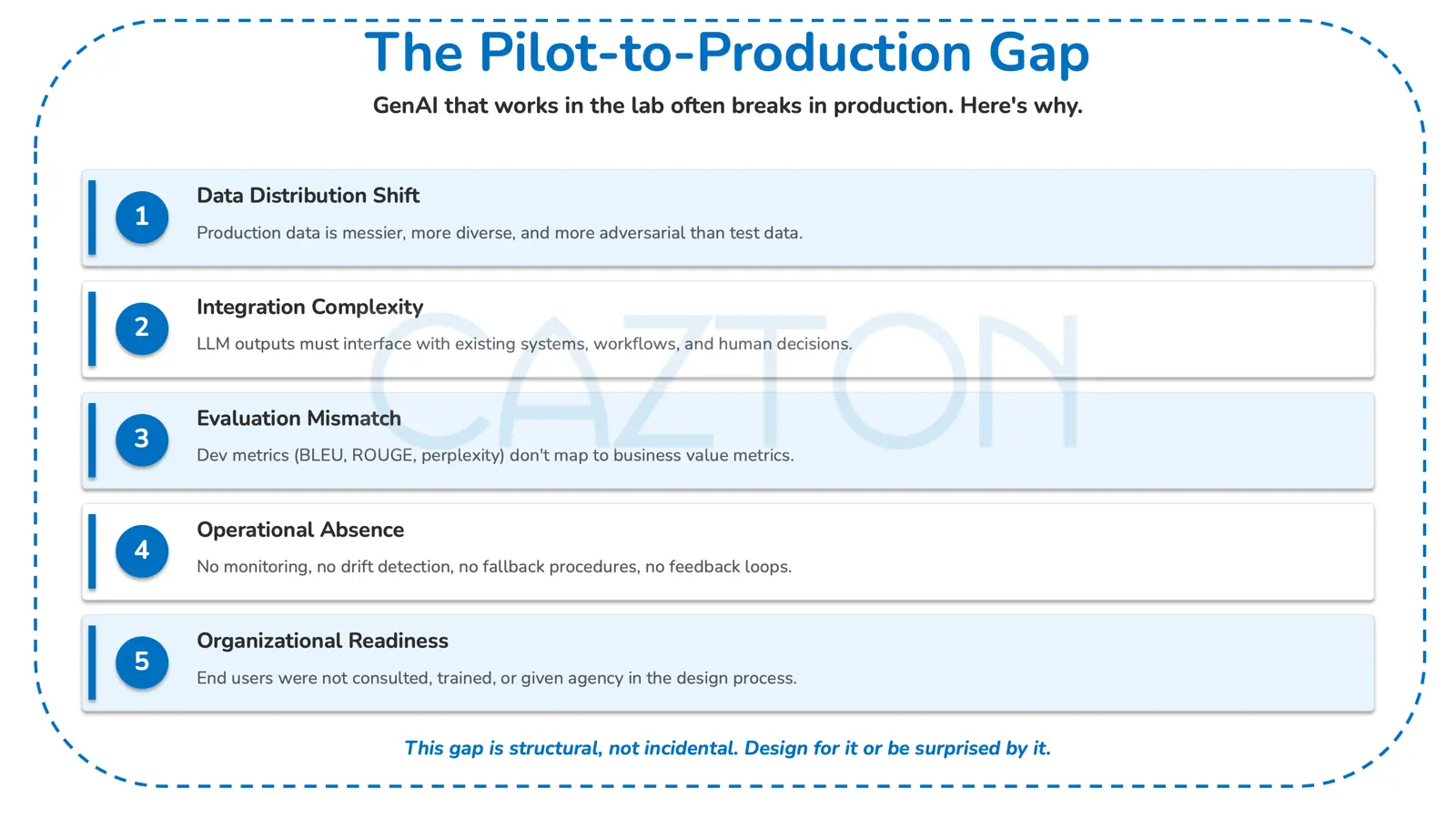 In our experience helping organizations deploy production GenAI systems, a recurring lesson is that failures are often not primarily technology problems. They are governance, evaluation, and operational maturity challenges that manifest through technology.