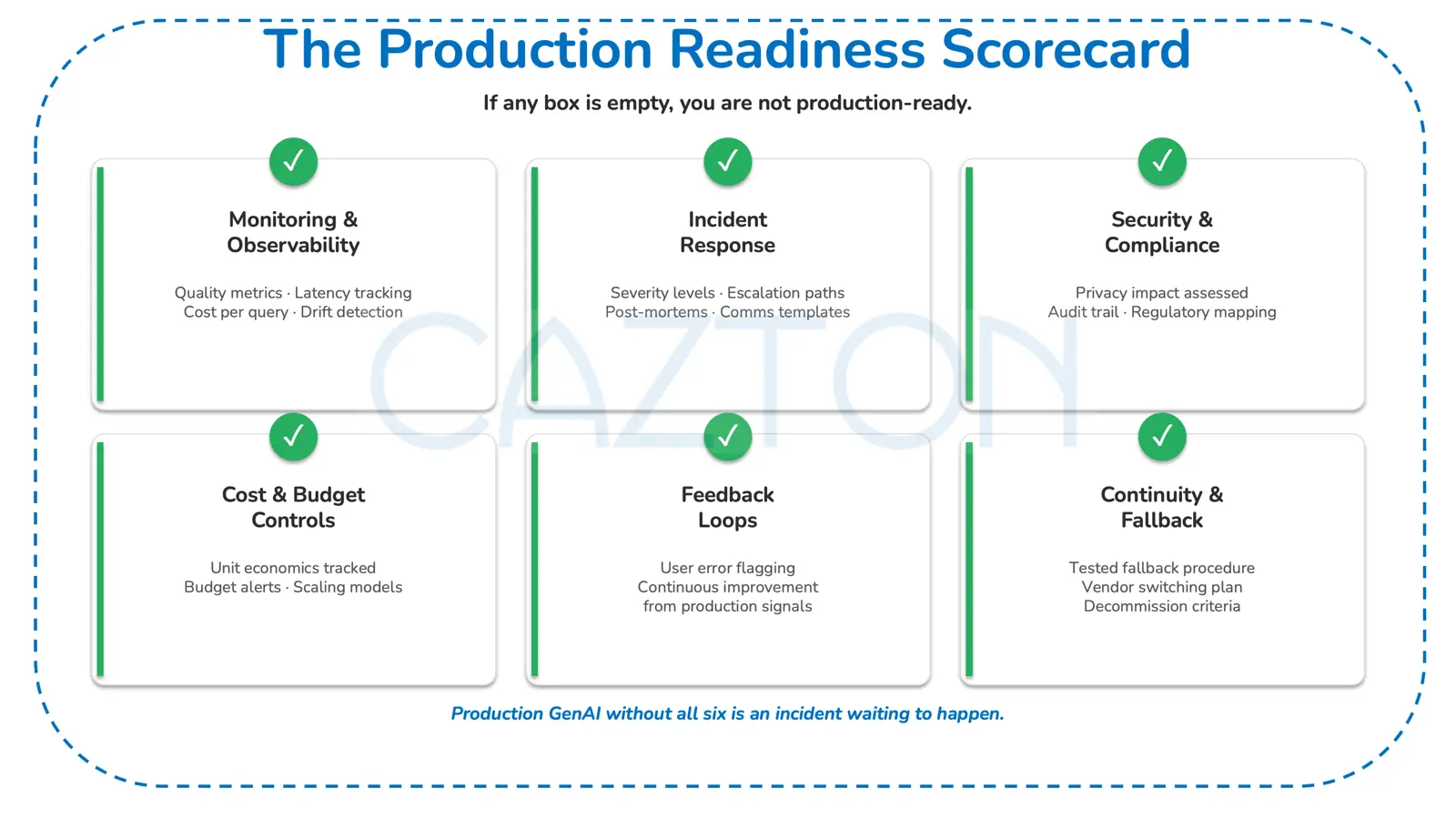 - Operational readiness framework: Combines a production checklist spanning monitoring, incident response, compliance, and fallback infrastructure with a build, buy, partner, or wait matrix that aligns each path's risks and governance emphasis to an organization's specific capabilities and constraints.