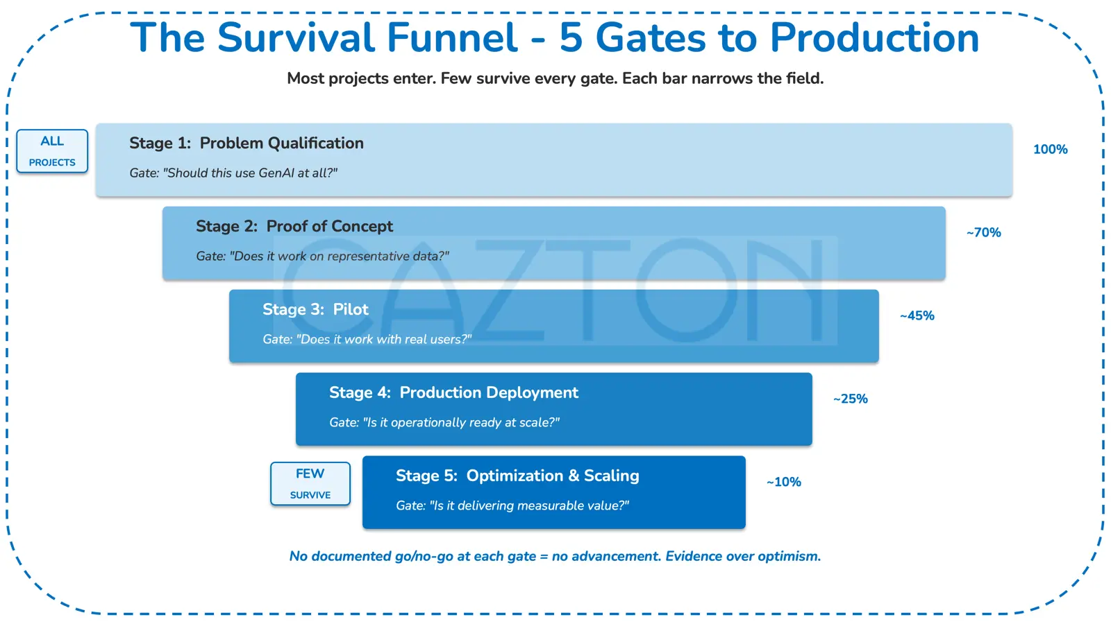 - Stage-gate framework: Moves GenAI initiatives through five phases: problem qualification, proof of concept, pilot, production deployment, and optimization and scaling. Each phase is governed by a specific gate question and documented go or no-go criteria that must be satisfied before advancement.