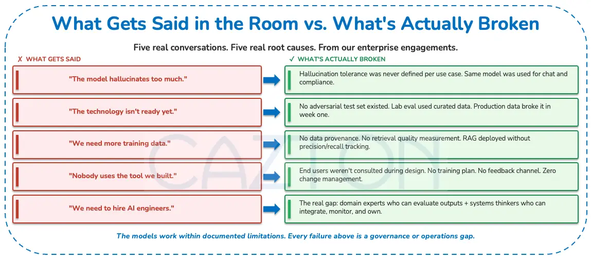 The models work, within documented limitations. Failures often occur in the space between model capability and organizational readiness: in undefined success criteria, in absent evaluation frameworks, in missing operational infrastructure, in talent gaps that are misdiagnosed as purely technical, and in governance structures that were designed for a different class of technology.