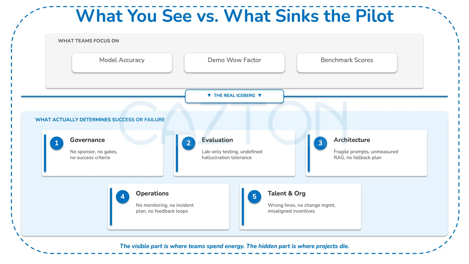 In our work helping organizations build production-ready GenAI systems, we've identified recurring patterns across governance, evaluation, and operational readiness. This analysis combines insights from published sources with frameworks we've developed and refined through direct client engagements. Our focus is on the five most common failure categories and, more importantly, the governance structures, evaluation practices, and operational controls that we've seen distinguish successful deployments from those that stall.