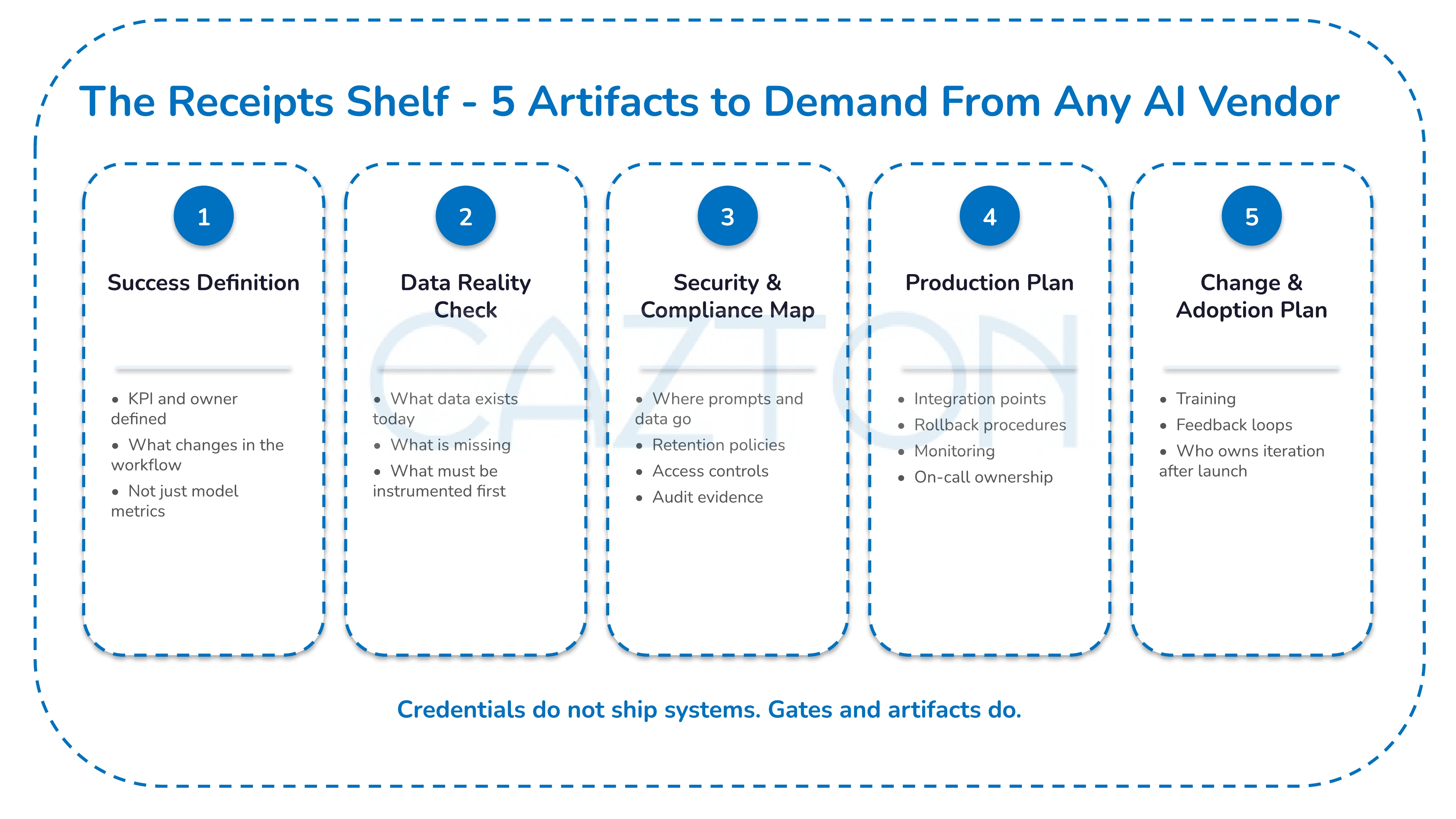 When you demand proof - an eval plan, a security map, a production plan - you prevent wasted quarters and broken trust.