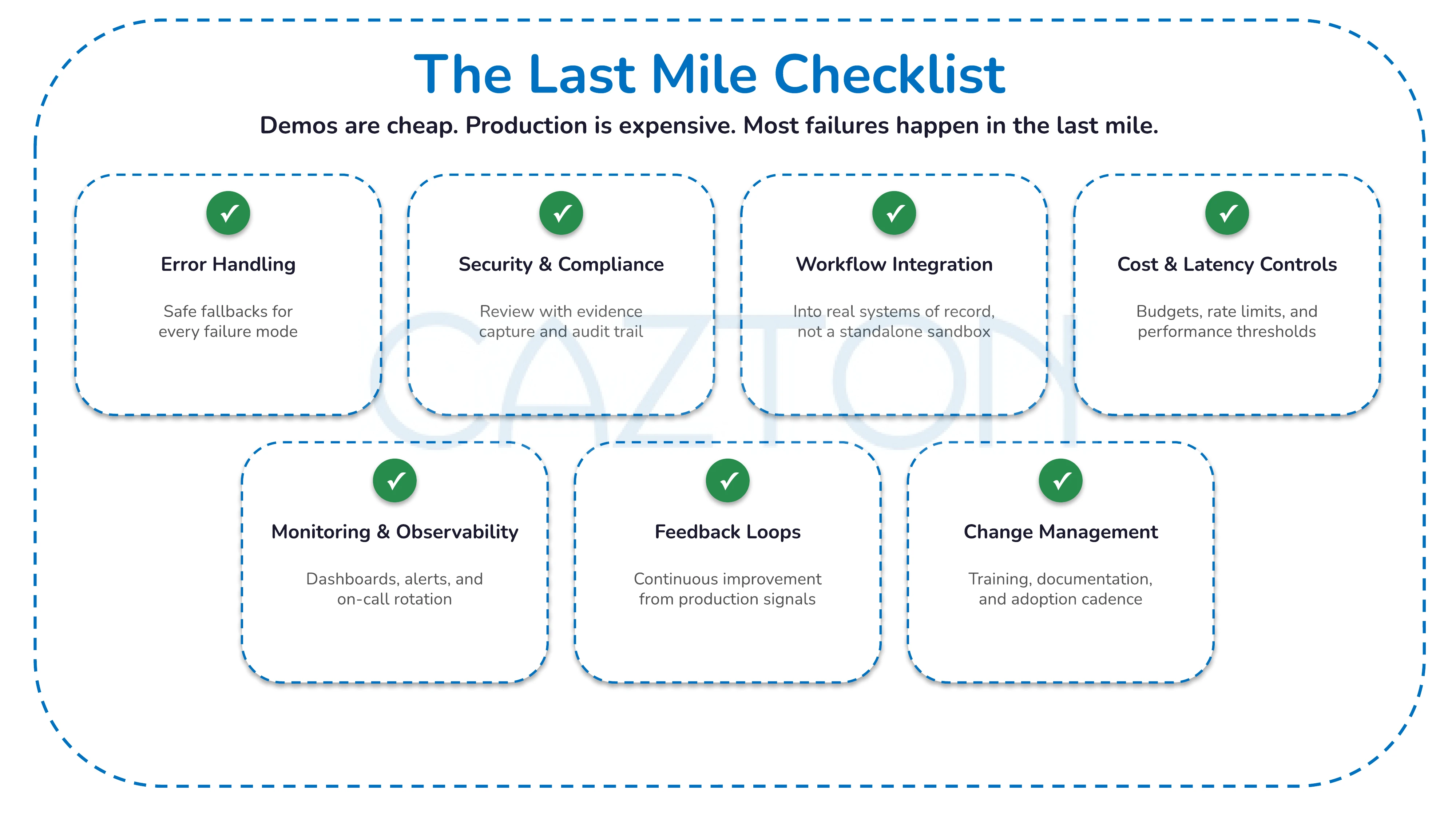 Our last-mile checklist covers everything that must exist before a system is production-ready: