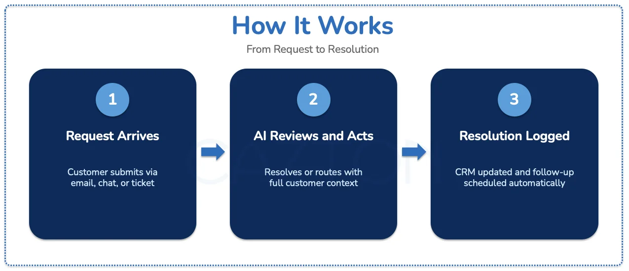 - Full request lifecycle: An AI employee handles customer service from initial intake through resolution and CRM logging without requiring human intervention for routine cases.