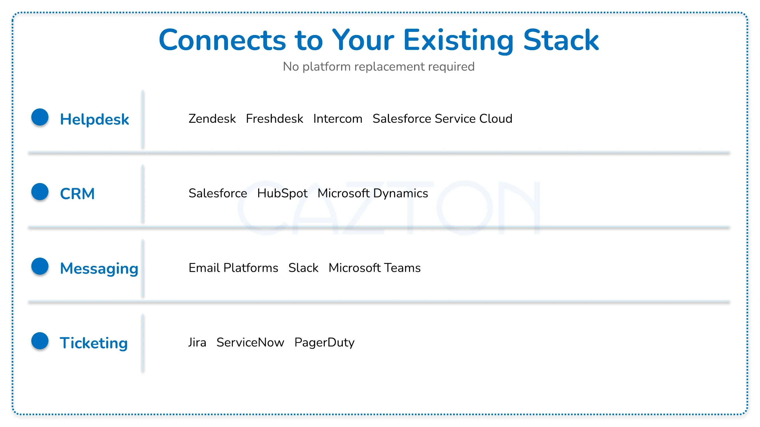 Whether your team runs on Salesforce, Zendesk, Freshdesk, or Intercom, the AI employee reads and writes records in real time as part of the resolution workflow, not as a separate step that depends on agent follow-through. Every resolved ticket, every message sent, and every customer preference captured becomes part of the permanent record. Your agents always have current context on escalated cases, your reporting reflects actual interaction history, and Cazton's integration engineering ensures the data flows reliably between your AI employee and your existing platforms from day one.