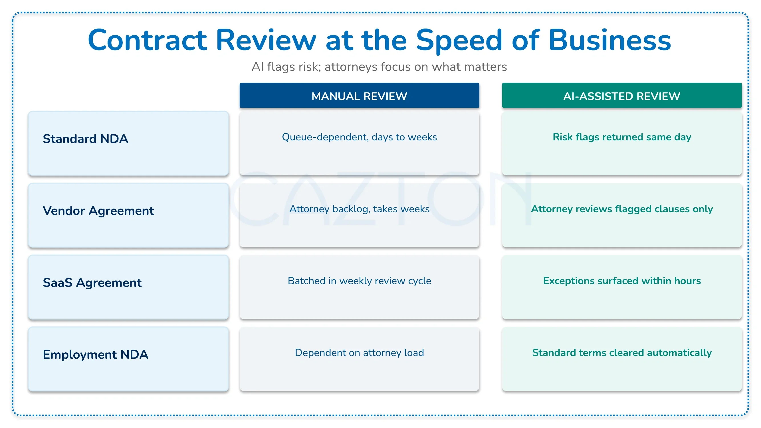 Result: Cazton built a contract review AI employee that processed incoming agreements against the legal team’s defined risk parameters, flagged clauses that deviated from standard terms or exceeded the thresholds the attorneys established, and generated a structured risk summary for each document. The legal team reviewed the summaries and the flagged provisions rather than reading each contract from beginning to end. Standard agreements with no material issues were cleared faster. Agreements with complex or unusual terms got more attorney attention because the routine review work was no longer consuming the same time. The business teams experienced a shorter turnaround on commercial contracts, and the legal team spent their review time on the provisions that actually required their judgment.