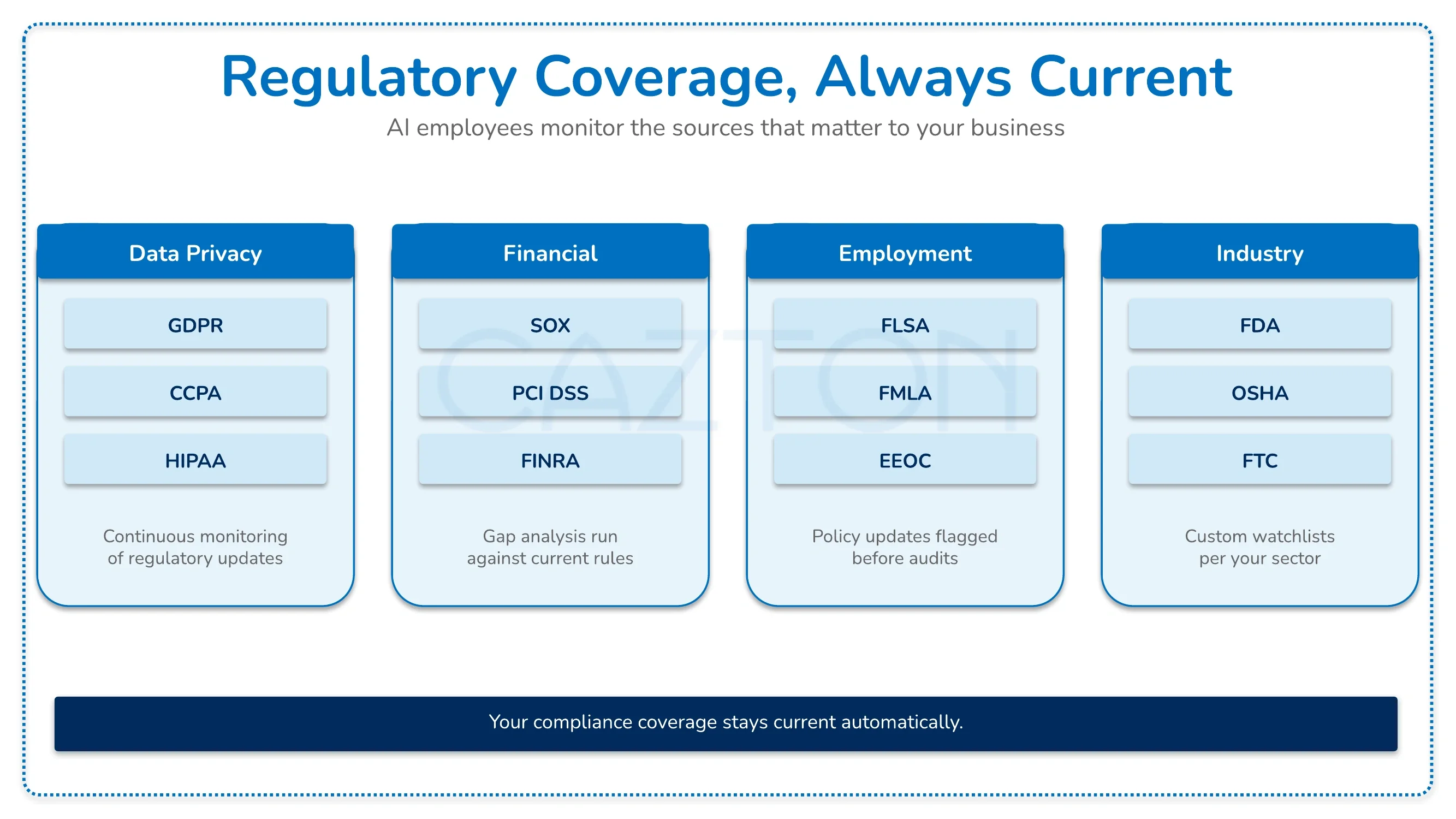 - Regulatory monitoring: AI employees track the regulatory sources relevant to your business and surface material updates before they become compliance gaps.